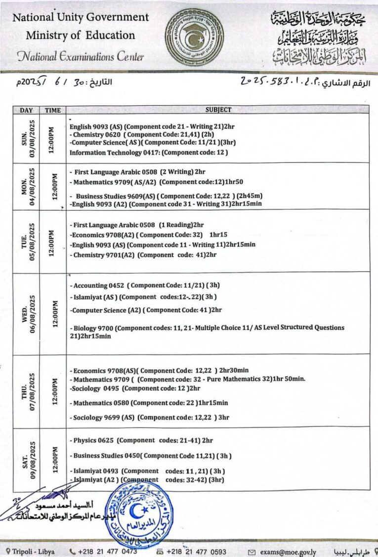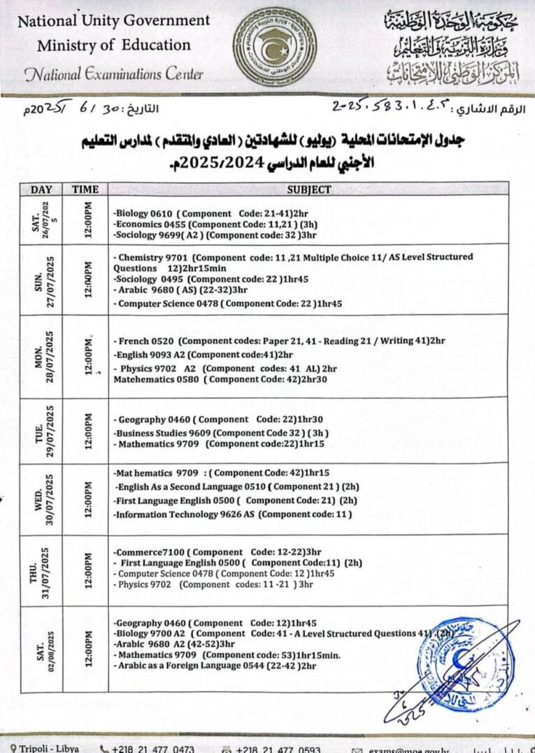 أعلن المركز الوطني للامتحانات التابع لوزارة التربية والتعليم بحكومة الوحدة الوطنية عن جدول الامتحانات المحلية لشهر يوليو لطلبة الشهادتين العادية والمتقدمة بمدارس التعليم الأجنبي، وذلك للعام الدراسي 2024 – 2025م.