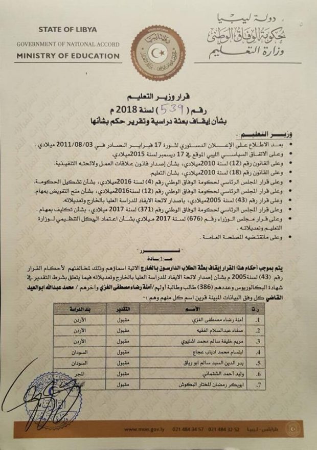 حيث استثنى قرار وزير التعليم بحكومة الوفاق عثمان عبد الجليل، الطلبة الذين تجاوزت مدة دراستهم سنتين، وكان آخر تقرير أكاديمي لهم بتقدير عام جيد فما فوق.