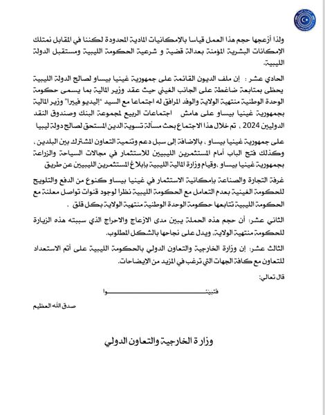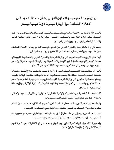 أصدرت وزارة الخارجية بالحكومة الليبية المكلفة من مجلس النواب (حكومة حماد)، بيانا بشأن زيارة مبعوث دولة غينيا بيساو.