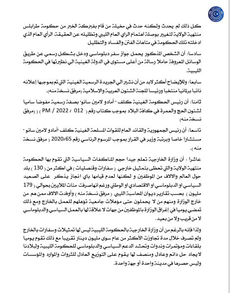 وتابع البيان: “أن الشخص المذكور يحمل جواز سفر دبلوماسي ودخل بشكل رسمي عن طريق الوسائل المعروفة حاملا رسالة من أعلى مستوى في الدولة الغينية إلى نظيرتها في الحكومة الليبية المكلفة”.