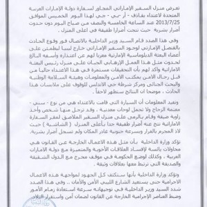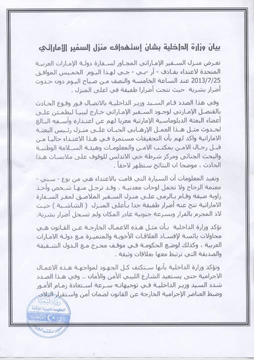 وزارة الداخلية تصدر بياناً بشان استهداف منزل السفير الاماراتي