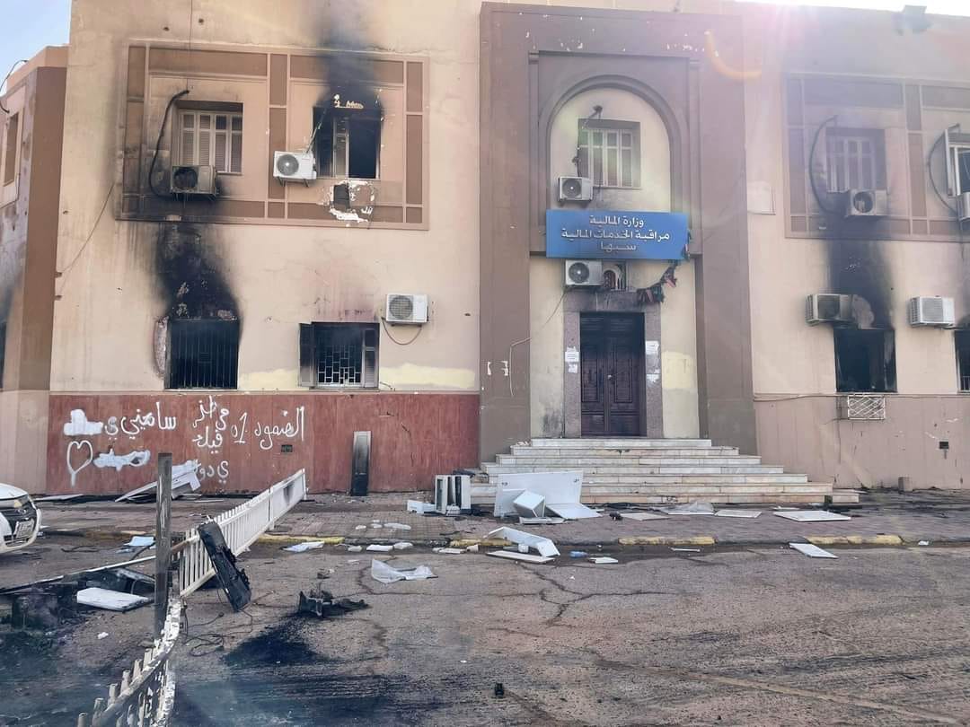 أدانت وزارة المالية بحكومة الوحدة الوطنية أعمال الشغب والتخريب والحرق التي تعرض لها مبنى مراقبة الخدمات المالية بمدينة سبها.