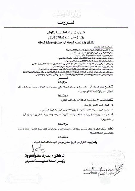 أصدرالعارف صالح الخوجة وزير الداخلية المفوض القرار رقم (503) لسنة 2017م بشأن رفع نقطة شرطة (أزود) إلى مستوى مركز شرطة يتبع مديرية أمن زليتن ويعمل المركز داخل النطاق الجغرافي للمنطقة الموجود بها.