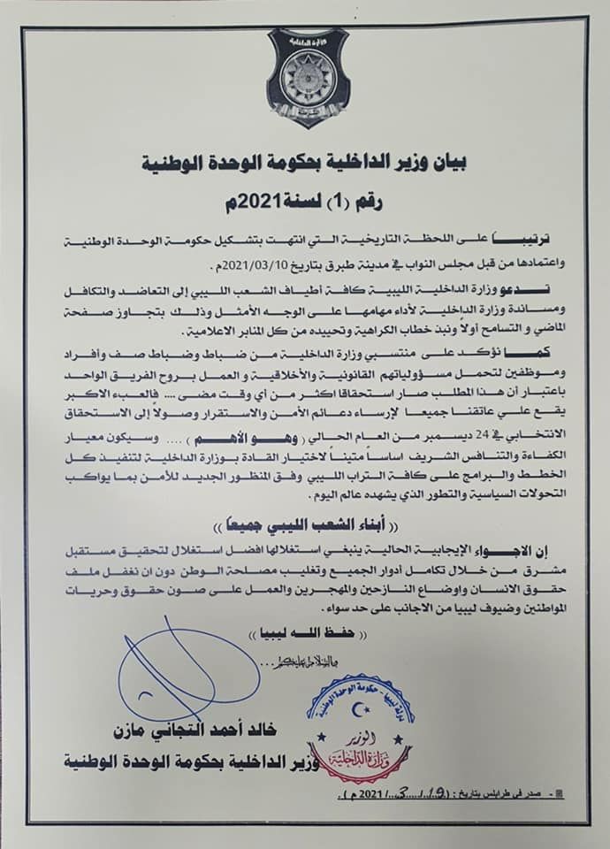 دعا وزير الداخلية بحكومة الوحدة الوطنية عميد خالد مازن، جميع أطياف الشعب إلى مساندة وزارة الداخلية في أداء مهامها على الوجه الأمثل، بتجاوز صفحة الماضي والتسامح أولا، ونبذ خطاب الكراهية وتحييده من كل المنابر الإعلامية.