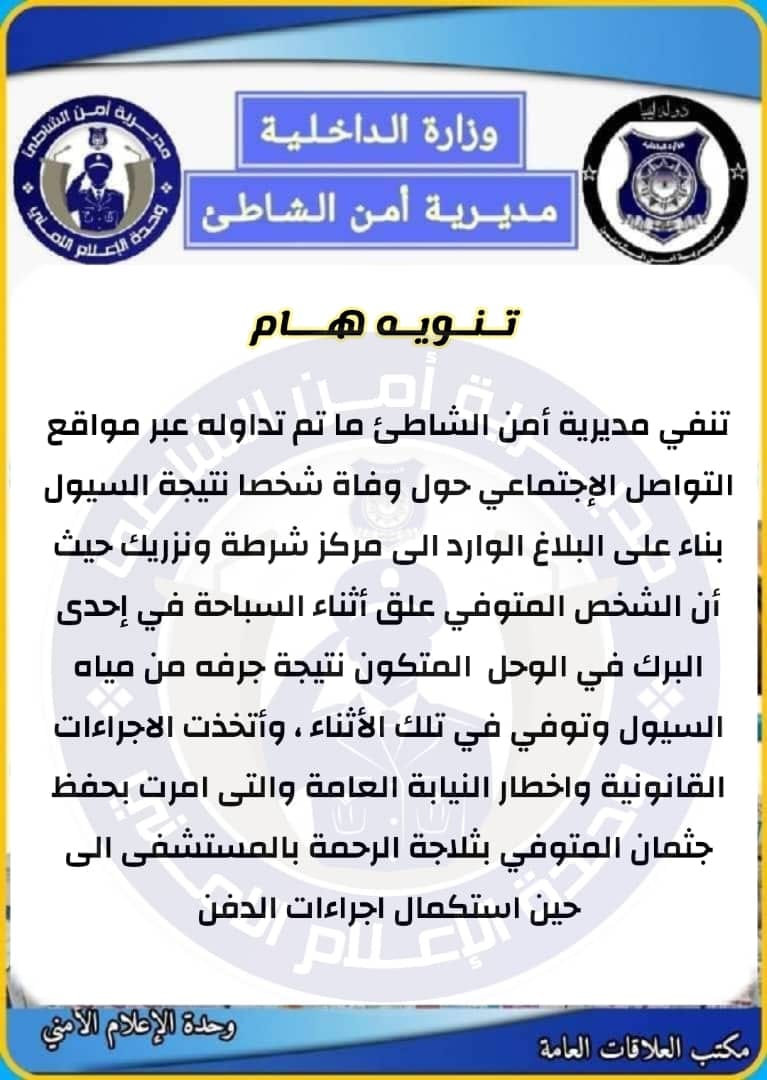 أعلنت مديرية أمن الشاطئ، التابعة لوزارة الداخلية بالحكومة المكلفة من مجلس النواب، “وفاة شخص غرقا، في منطقة “ونزريك”، نتيجة السباحة في إحدى البرك التي شكلتها السيول”.