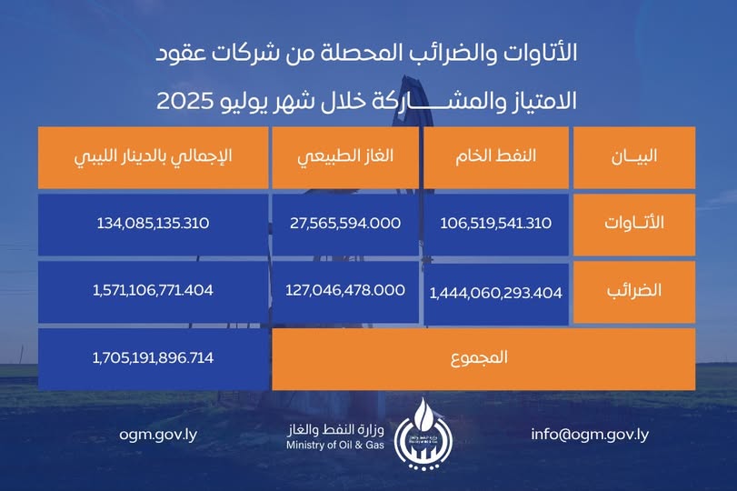 أعلنت وزارة النفط والغاز بحكومة الوحدة الوطنية أن الإتاوات والضرائب المحصلة من شركات عقود الامتياز والمشاركة خلال شهر يوليو 2025 بلغت أكثر من 1.7 مليار دينار ليبي.