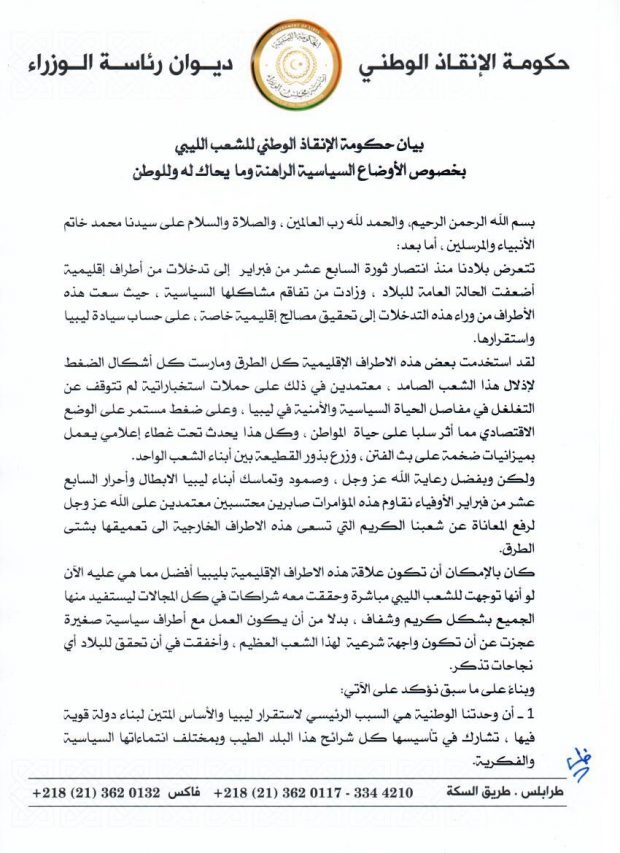 بيان حكومة الإنقاذ الوطني للشعب الليبي بخصوص الأوضاع السياسية الراهنة وما يحاك له وللوطن