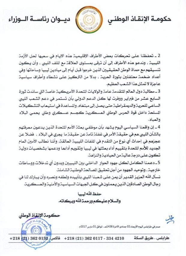 وصل لعين ليبيا باينًا أصدرته حكومة الإنقاذ برئاسة خليفة الغويل تُدين فيه المحاولات الإقليمية لحل الأزمة بليبيا.