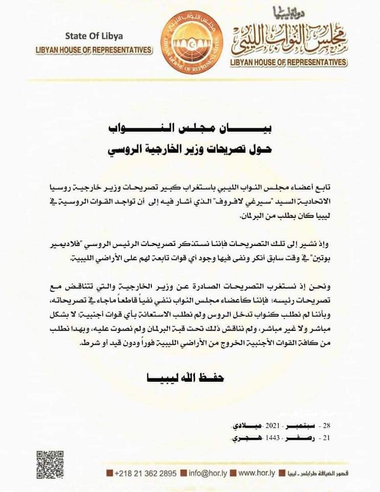 وجاء البيان رداً على تصريحات وزير الخارجية الروسي في نيويورك، حيث أشار إلى أن تواجد القوات الأجنبية في الشرق الليبي تم بناء على طلب مجلس النواب الليبي.