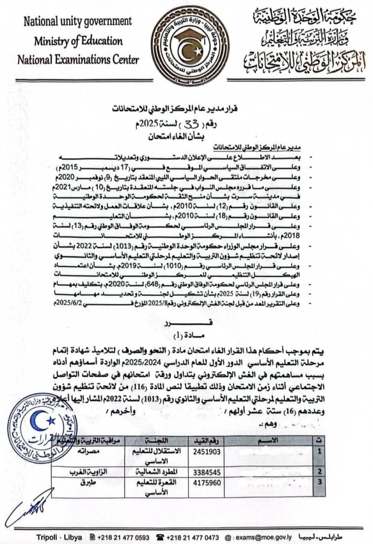 وشمل القرار أسماء التلاميذ المعنيين وأرقام قيدهم واللجان الامتحانية التابعين لها، موزعين على عدد من المناطق التعليمية، منها: طرابلس، الزاوية، مصراتة، بنغازي، طبرق، مزدة، العزيزية، درنة، سوق الجمعة، وحي الأندلس.