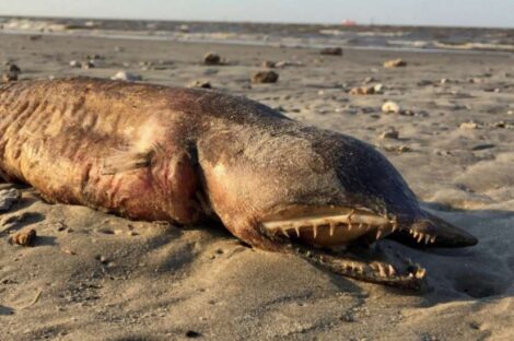 تم اكتشاف مخلوق غريب بأسنان كبيرة، بدون عيون وشكل جسم غريب من قبل أحد السكان المحليين أثناء المشي على الشاطئ...