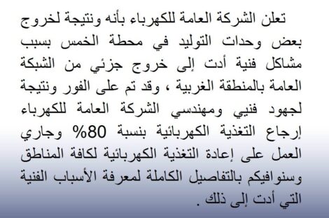 عين ليبيا أعلنت الشركة العامة للكهرباء أنه نتيجة لخروج بعض وحدات التوليد في محطة الخمس بسبب مشاكل فنية أدت...