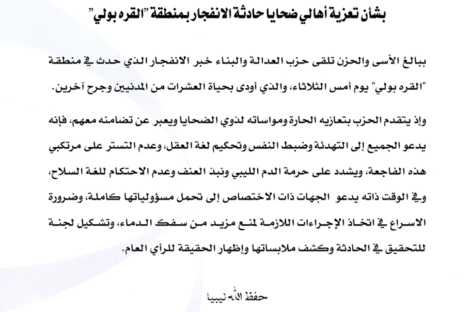 وكالة ليبيا الرقمية تلقى حزب العدالة ببالغ الأسى والحزن خبر الانفجار الذي حدث في منطقة “القره بولي” يوم أمس...