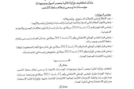 كلفت رئاسة الوزراء وزارة المالية بحصر أصول وموجودات مؤسسات ما يسمى بنظام سلطة الشعب سابقا ومراجعة حسابات هذه المؤسسات....