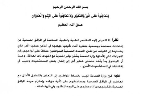 أهابت وزارة الصحة، اليوم الاثنين، المواطنين التعامل الأمثل مع العاملين في المرافق الصحية ومساعدتهم على تأدية مهامهم واحترام حرمة...