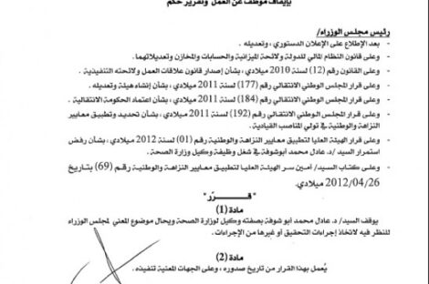 أصدر السيد عبدالرحيم الكيب القرار رقم 123 لسنة 2012 بشأن إيقاف الدكتور عادل محمد ابوشوفة وكيل وزارة الصحة عن...