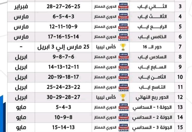 أعلن الاتحاد الليبي لكرة القدم، عبر لجنة تنظيم المسابقات، عن برنامج النصف الثاني من الموسم الرياضي 2025/2026، والذي يشمل مواعيد…