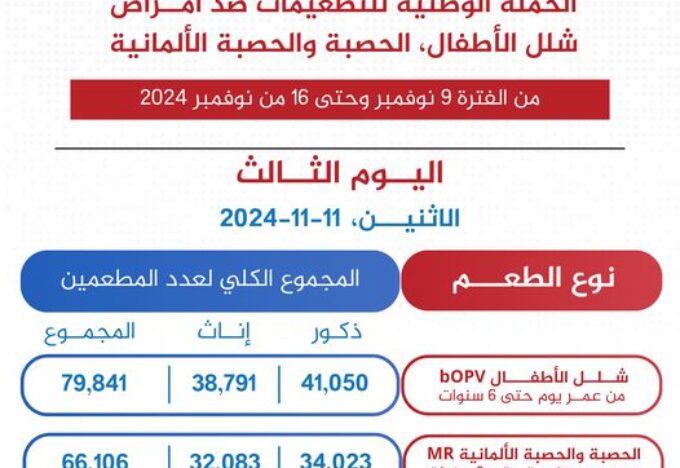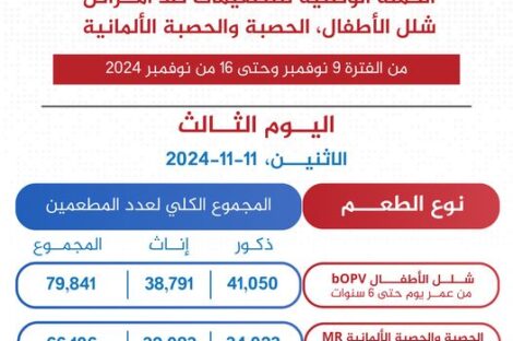 أعلن المركز الوطني لمكافحة الأمراض، في إحصائية نشرها، بعد انتهاء اليوم الثالث للحملة الوطنية للتطعيم، وصول إجمالي عدد الأطفال المطعمين…