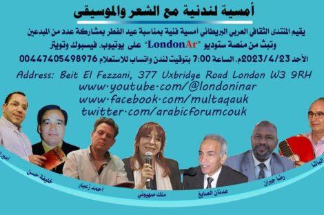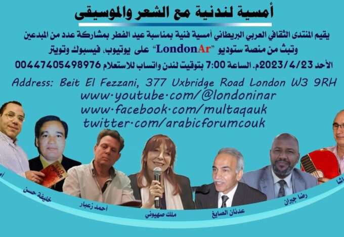 يقيم المنتدى الثقافي العربي البريطاني أمسية فنية بمناسبة عيد الفطر المبارك، وبمشاركة ليبية من قبل الدكتور خليفة حسن والدكتور رضا…