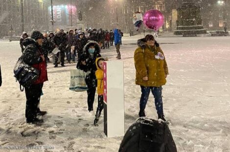 بسبب صورة 200 شخص بلا مأوى، يصطفون في طوابير في درجات حرارة شديدة البرودة وسط الثلوج، ليحصلوا على الطعام في…