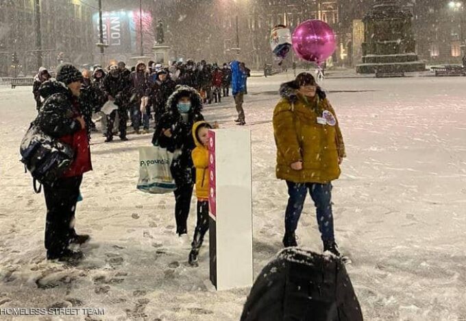 بسبب صورة 200 شخص بلا مأوى، يصطفون في طوابير في درجات حرارة شديدة البرودة وسط الثلوج، ليحصلوا على الطعام في…