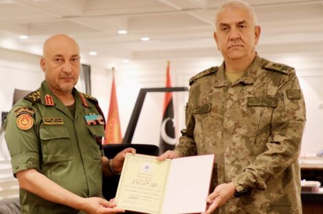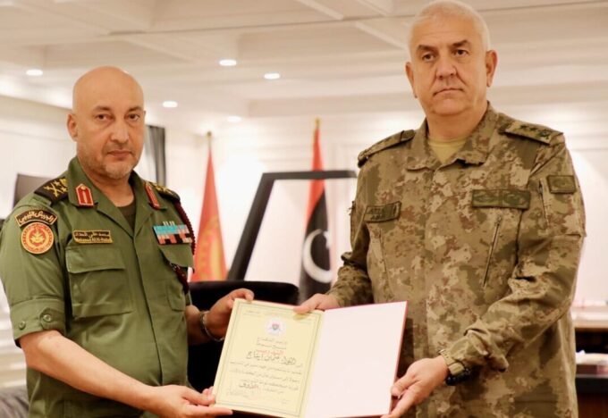 سلم رئيس الأركان العامة للجيش الليبي الفريق أول ركن “محمد الحداد” الثلاثاء، قائد بعثة التدريب التركية في ليبيا، نوط التدريب…
