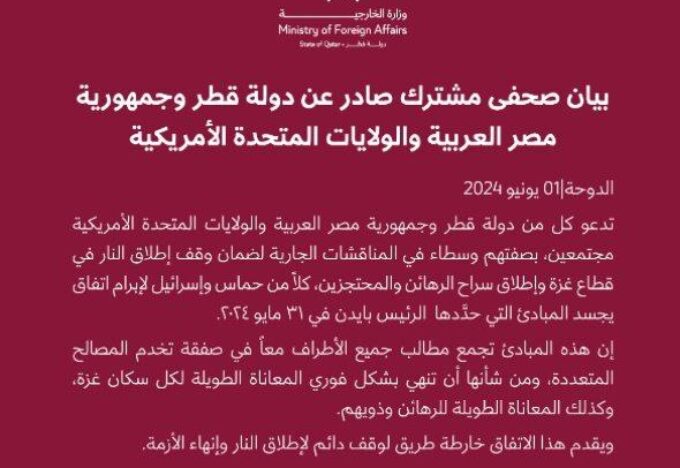 أصدرت قطر ومصر والولايات المتحدة، بيانا مشتركا حول اقتراح الرئيس الأمريكي “جو بايدن” حول غزة. وقالت الخارجية القطرية في البيان:…
