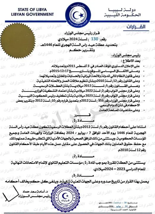 قرر رئيس الحكومة الليبية المُكلفة من مجلس النوّاب أسامة حماد، “منح يوم الأحد القادم عطلة رسمية بمناسبة حلول العام الهجري الجديد 1446، بكافة الوزارات والهيئات العامة وجميع المؤسسات الحكومية، مع استثناء المرافق الصحية والجهات الأمنية التي تتطلب طبيعة عملهم ذلك”.